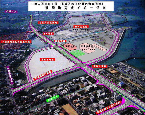 糸満道路が通過する糸満市潮崎地区(南浜埋立)では、平成14年5月に糸満市庁舎の移転が予定されており、このため南部国道事務所では新糸満市庁舎のアクセスの確保のため、本地区の整備を急いでいるところです。潮崎地区は市庁舎や市民会館などの市の中心施設や、住宅、商業地などによる新たな街が形成されることになり、新しい街づくりにあたっては、糸満市の歴史、文化や市民の生活や既存市街地との調和も必要となります。
