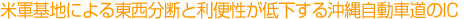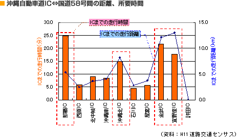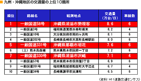| 沖縄県を南北に縦貫する幹線道路において、国道58号、国道329号、国道330号は交通容量を超過する交通を処理するのに対して、沖縄自動車道は交通容量に余裕があります。計画されている西海岸道路とあわせて、南北幹線道路の容量拡大およびアンバランスな利用特性の是正が重要となります。 |