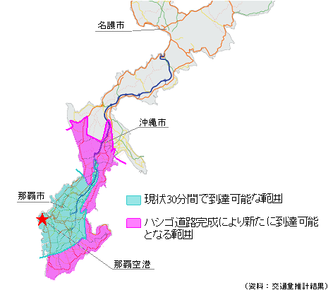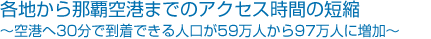 「ハシゴ道路」を整備することにより、那覇空港へ30分で到着できる人口は、現況の59万人から97万人に増加します。 |
