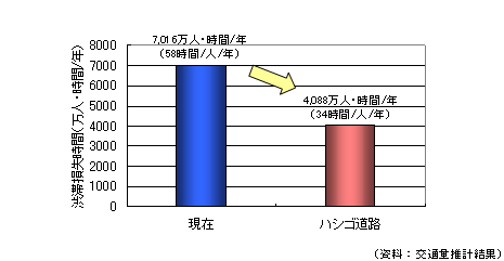 「ハシゴ道路」を整備することにより、1人あたり1年間に浪費する時間(渋滞損失時間)が34時間に短縮します(現況と比べて24時間短縮)。