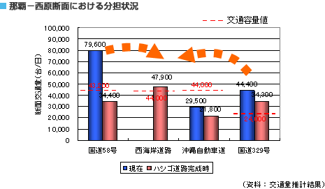 | 沖縄県においては西海岸地域を縦断する国道58号に交通需要が集中し、渋滞損失が集中している状況にあります。はしご道路の整備により、国道58号に集中していた南北方向の交通需要が分散されます。 |