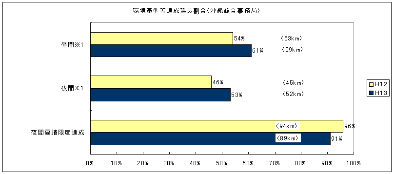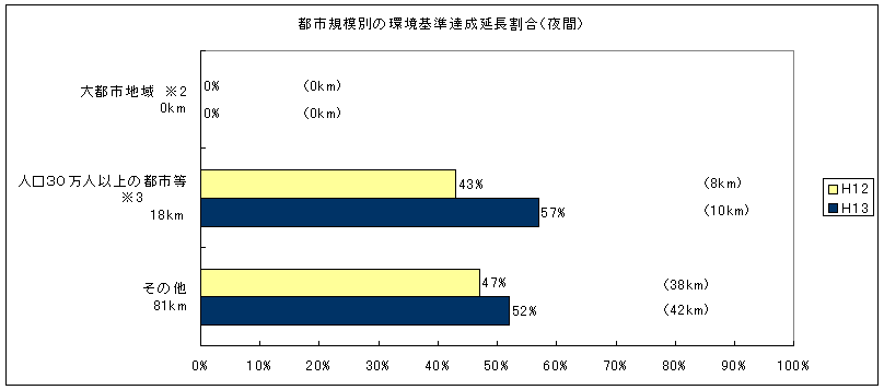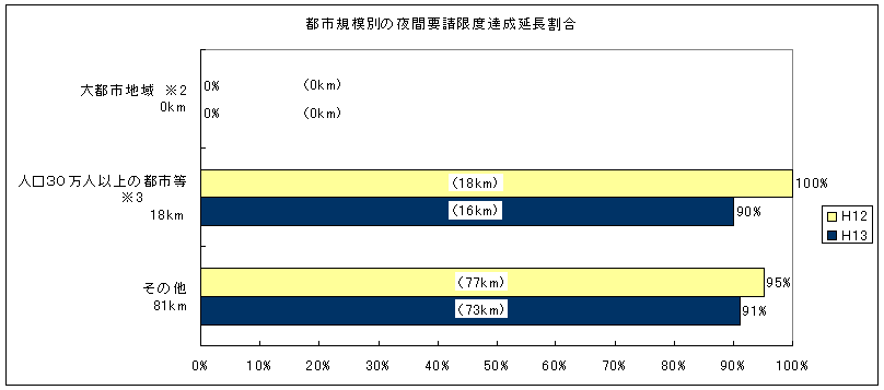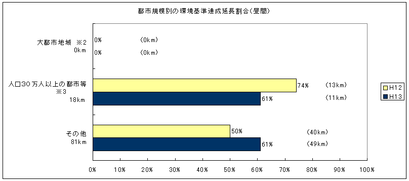 環境基準達成区間距離は「騒音の新環境基準」(平成10年9月30日環境庁告示)における幹線道路近接空間の基準値を踏まえ、 昼間においては70dB(等価騒音レベル)、夜間においては65dB(等価騒音レベル)を達成する区間を集計している。 |