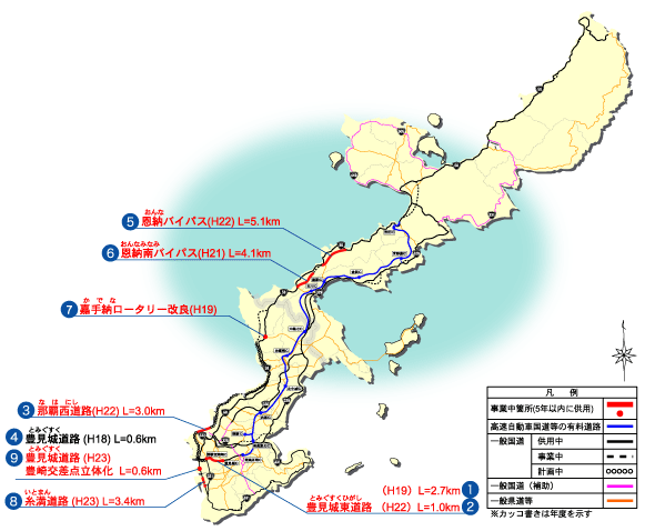 | 2 | H22年度 豊見城・名嘉地IC〜豊見城市名嘉地 1.0km 2/4車線供用 |