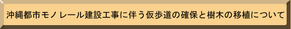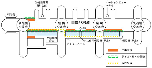 | 沖縄総合事務局・南部国道事務所では、「沖縄都市モノレール」の平成15年度供用を目指して、直轄国道(国道58,329,331号)における建設工事を行っています。 一般国道58号久茂地地区(泉崎交差点〜新旭橋交差点までの約500m)においても、今後順次下部工の建設に着手し、工事も本格化してきます。 当該地区は交通量も多く、工事のための施工ヤードも十分に確保できない状況にあり、@仮歩道や那覇港向け左折レーン(仮設)の確保、A久茂地側沿いに植えられたデイゴの移植(約60本)等が必要となります。 仮歩道につきましては、工事期間中も狭小ながら確保する予定ですが、クレーン等の旋回のため、止むを得ず通行止めを行う場合もあります。また、樹木の移植等につきましては、1月中旬より順次移植を開始し、工事完了後は、モノレールの構造物に支障のない範囲で元の場所へ戻すように計画しております。 つきましては、工事期間中(概ね平成12年〜平成13年度)、県民の皆様には何かとご迷惑をお掛けいたしますが、ご理解とご協力をお願いいたします。 |