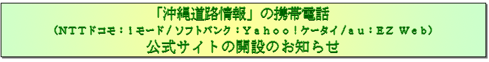 沖縄総合事務局開発建設部道路建設課・道路管理課では「沖縄道路情報提供システム」について、現在提供しているインターネット(http://www.road.dc.ogb.go.jp/)に加え、携帯電話でも情報を提供中です。
