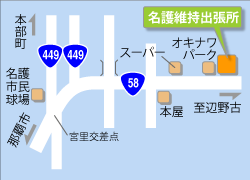 〒901-0234 沖縄県名護市字名護4618-34番地 TEL: 0980-52-0165 ・道路占用申請 :管理係 ・請願工事申請 :管理係